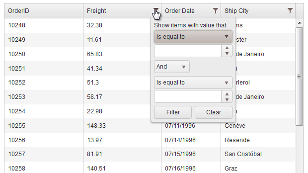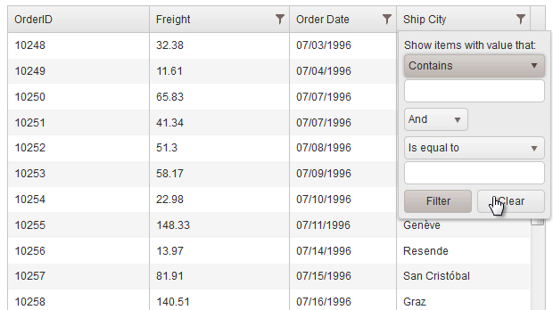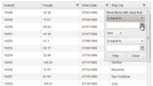 The default filtering interface for Kendo Grid is very powerful. However, it is generic to accommodate for all kind of data that you can throw at it.